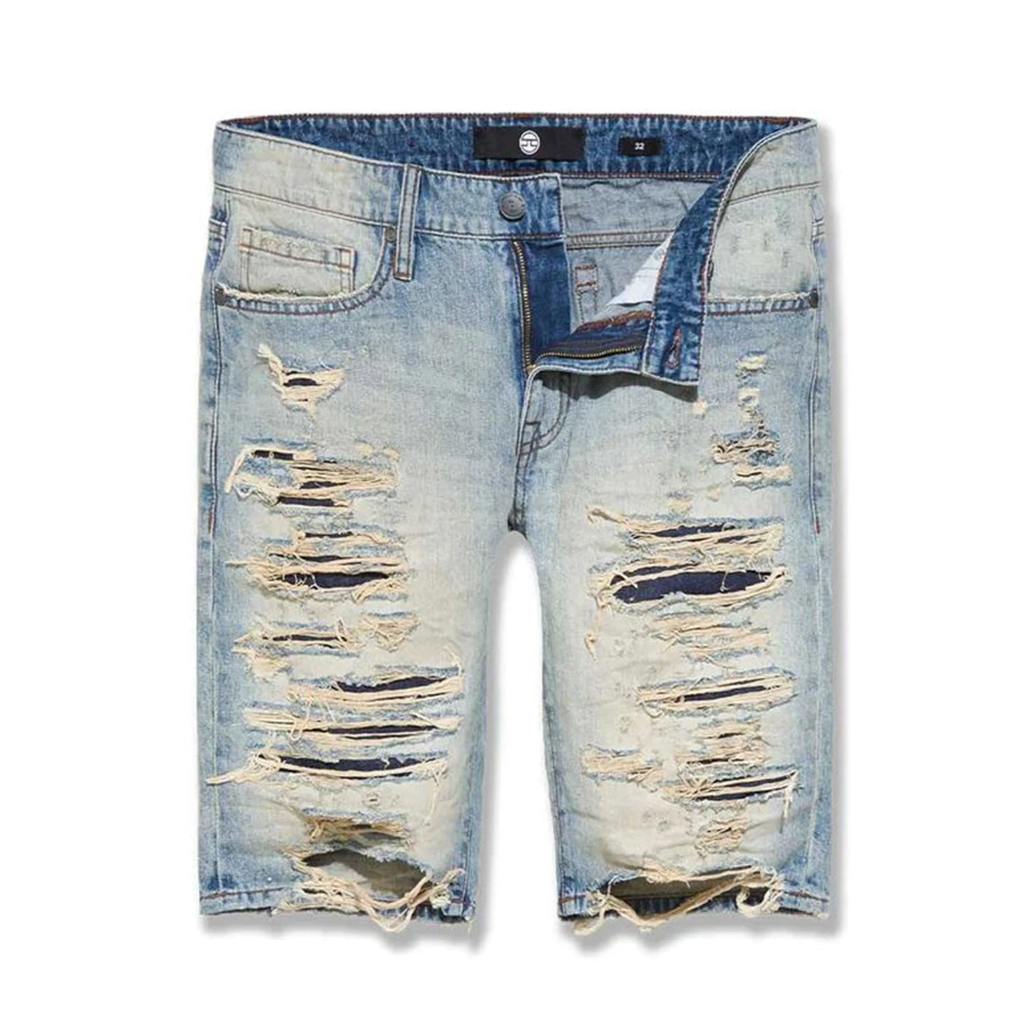 - Shredded denim shorts with fused shreds